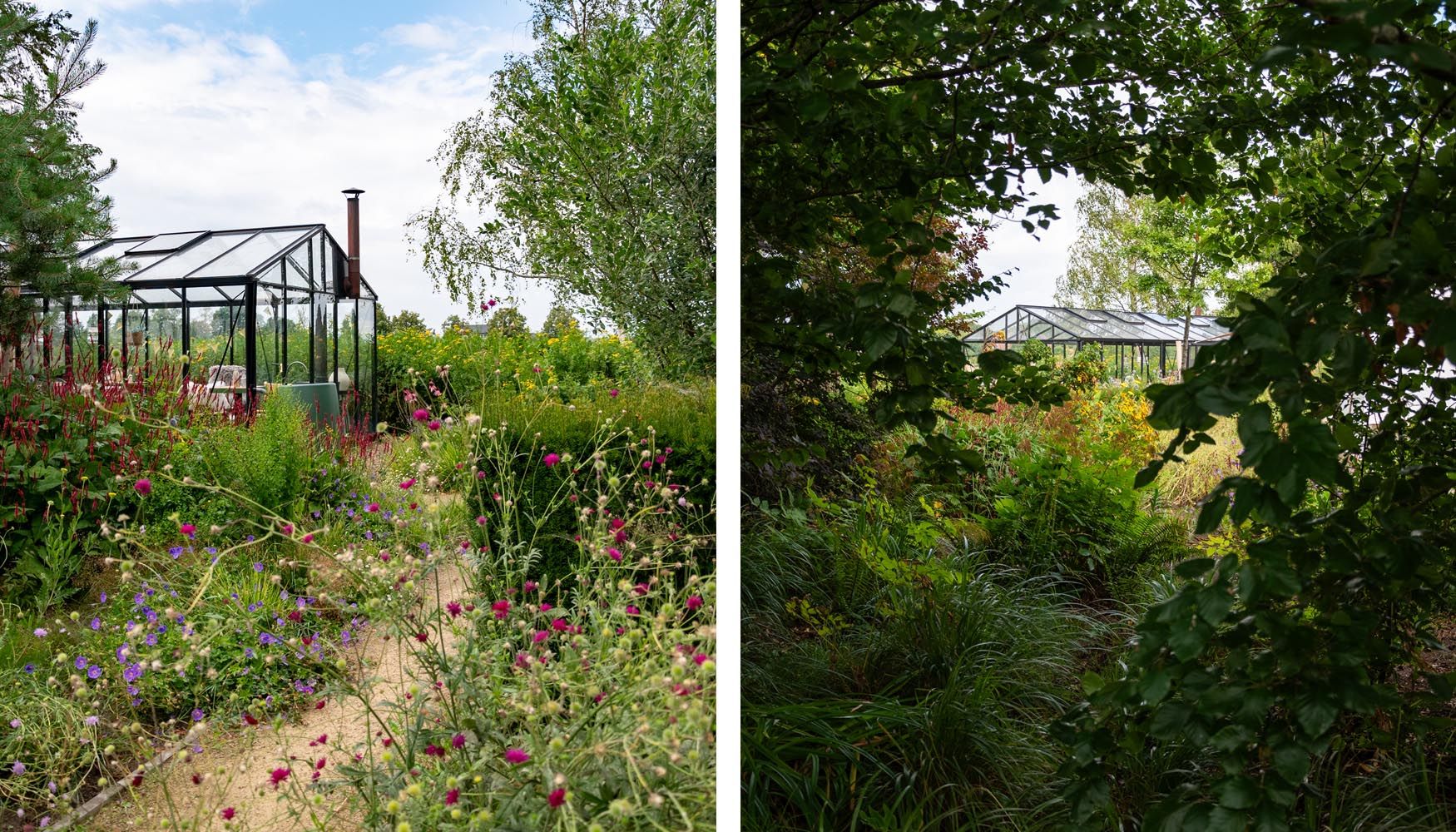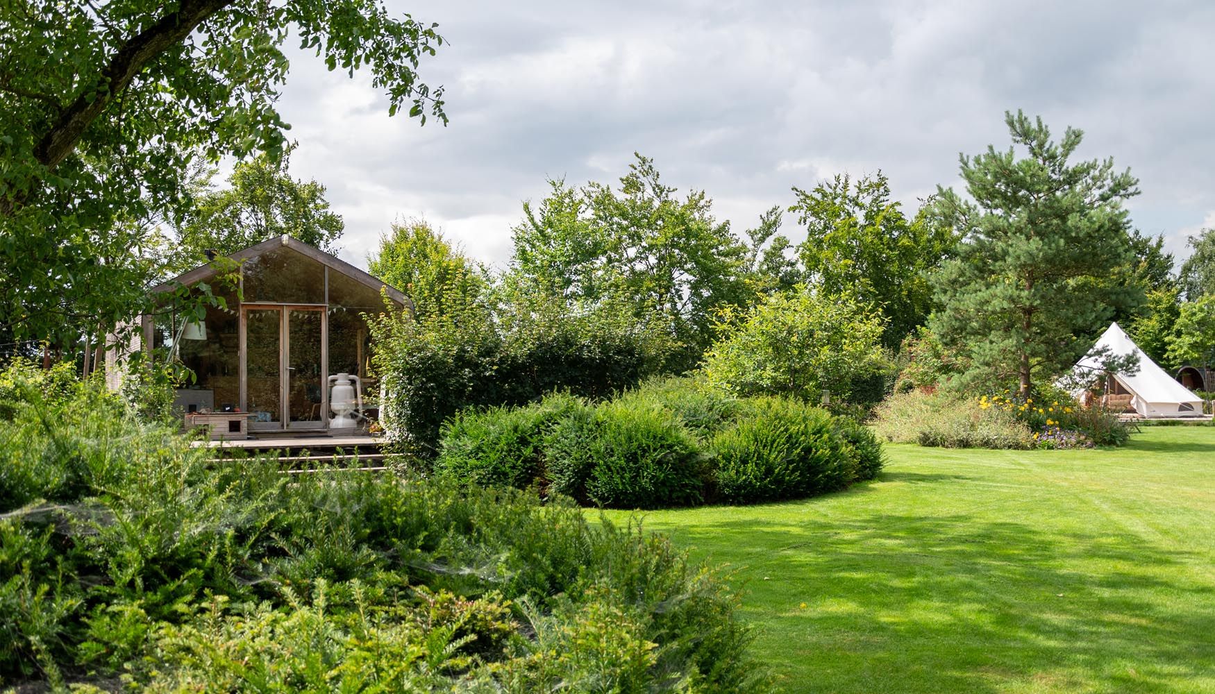 Grote wolken van taxus zorgen voor een groene en rustige basis in het geheel. Tevens geven ze meer intimiteit rond hun tijdelijke woning. De bomen en planten in de borders hebben we laten aansluiten op de bosrijke omgeving.